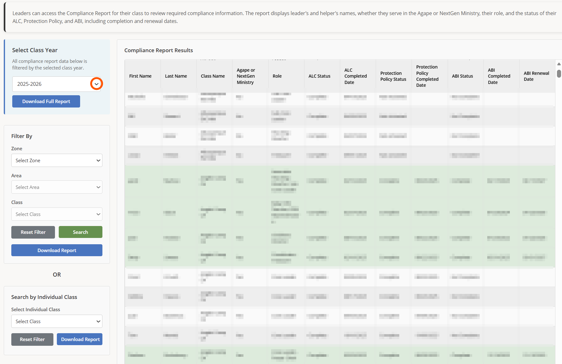 3.) Click Download Full Report to download the compliance report for all of the classes you shepherd. The file can be opened in any spreadsheet application, e.g. Microsoft Excel or Apple Numbers.