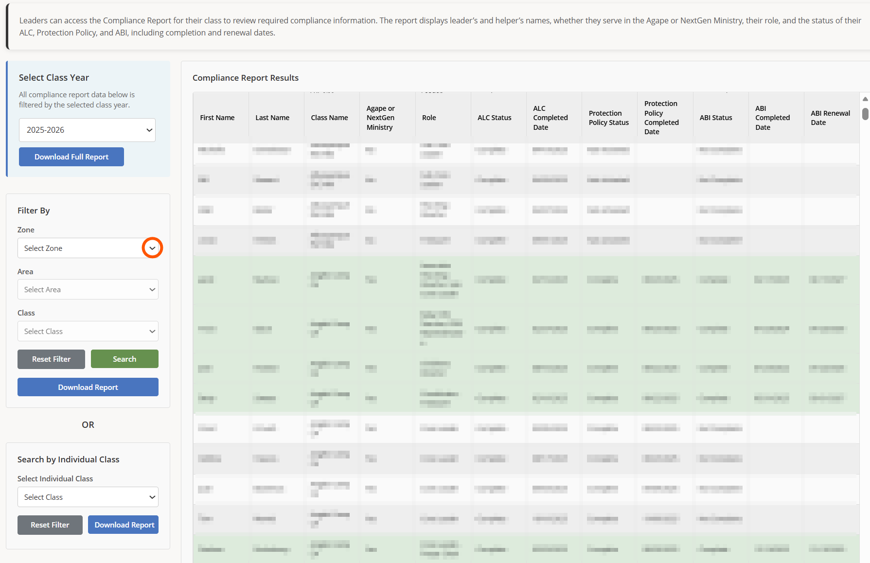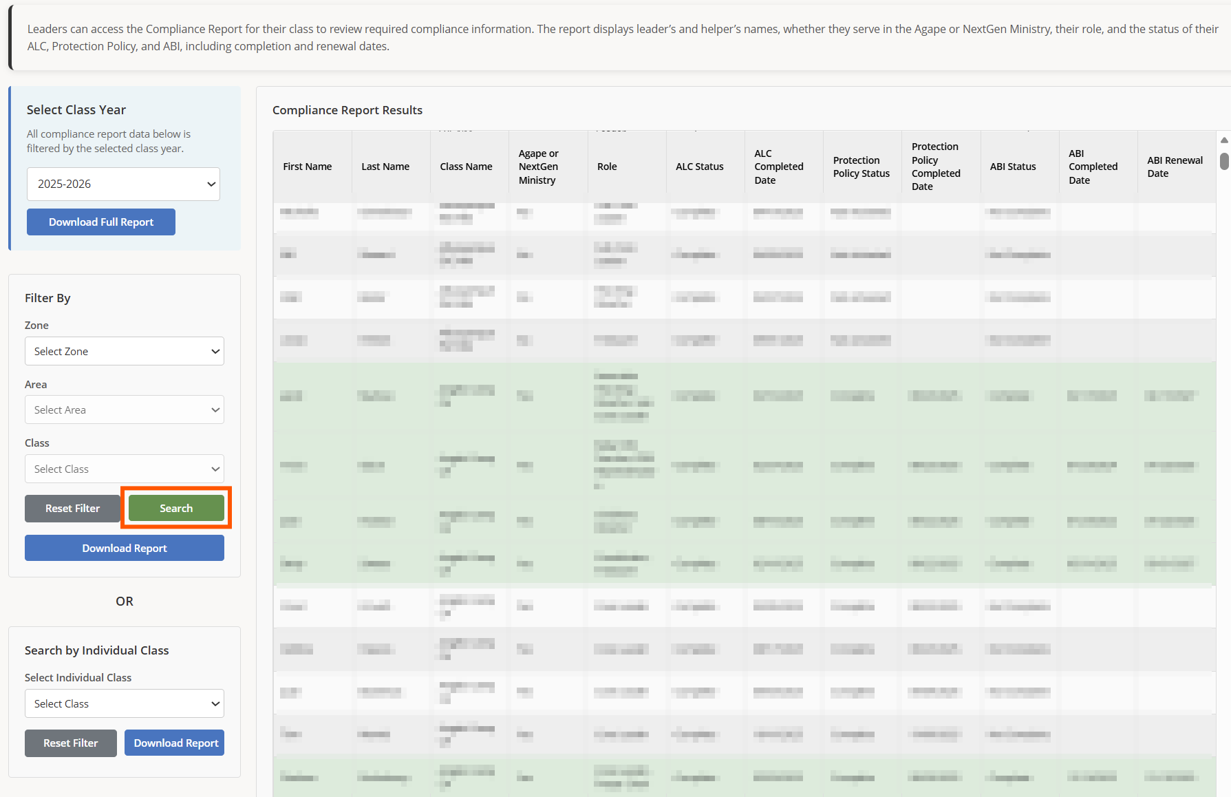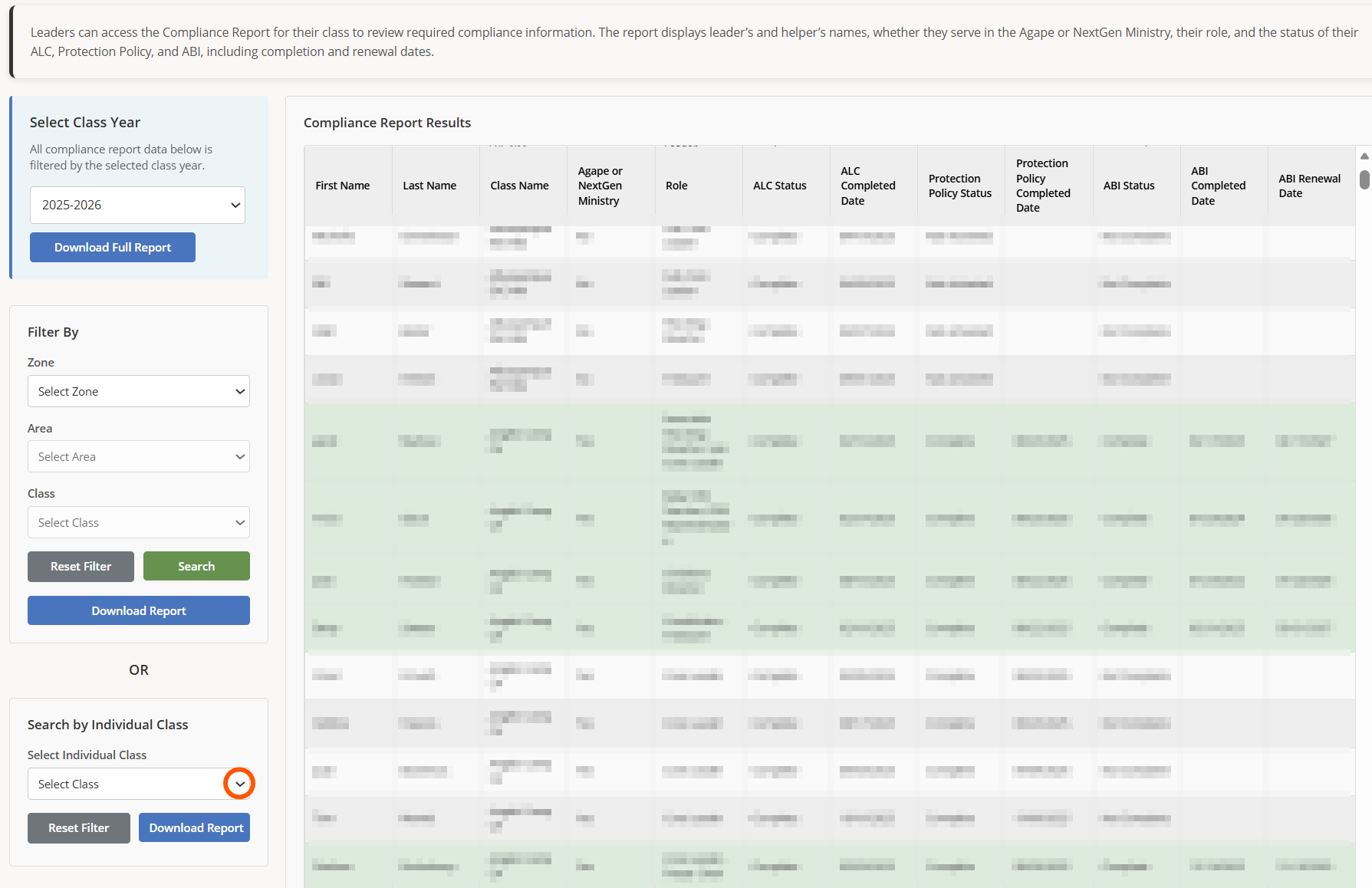 8.) Click Download Report to download the compliance report for the selected class. The file can be opened in any spreadsheet application, e.g. Microsoft Excel or Apple Numbers.