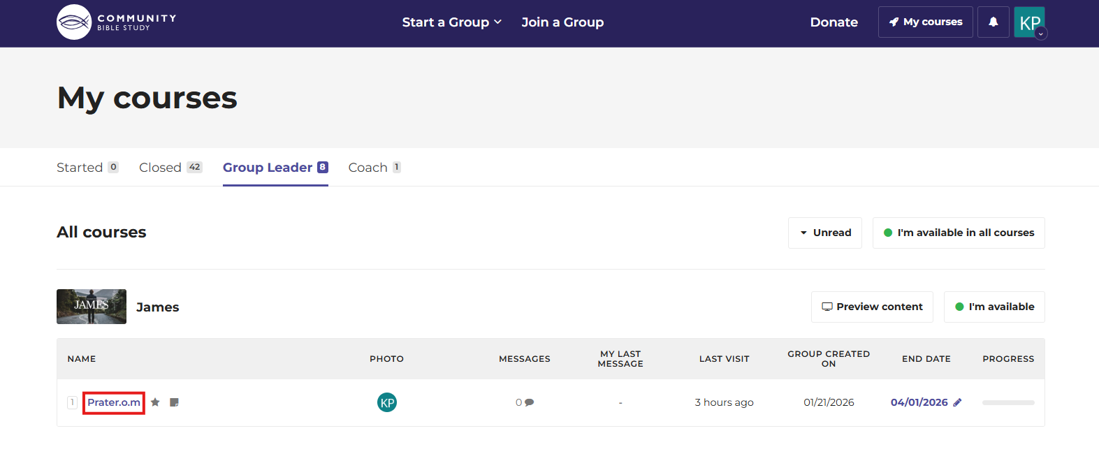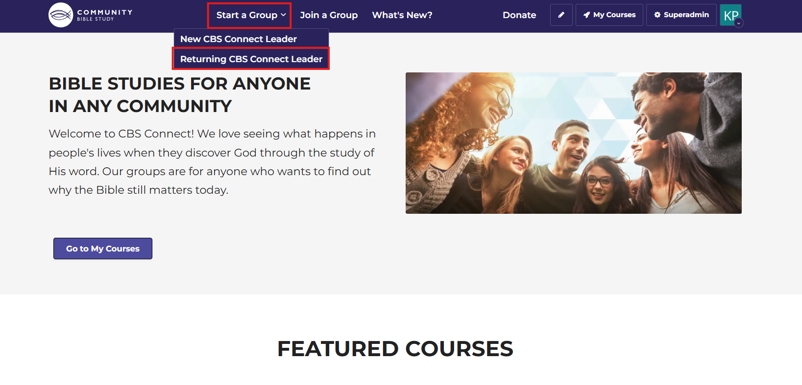 Please note that in order to create a group in a new course, you must have an active group open in the platform. If you do not have an active group open in the platform, click on “Start a Group” at the top of the homepage and select “Returning CBS Connect Leader”. This will take you to the Returning Leader Form where you can select the course that you would like to do. You will receive an email when your course is created and you can invite participants.