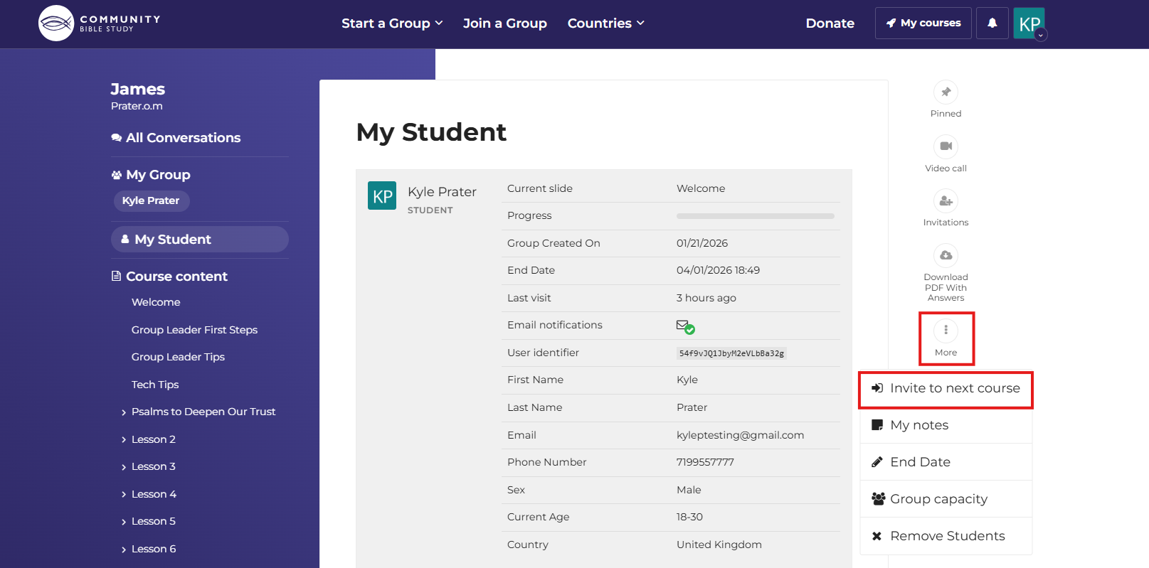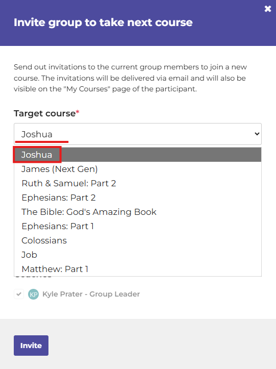Note: You must have at least one person enrolled in your group in the platform in order for the option to invite your group to the next course to show in the menu.
